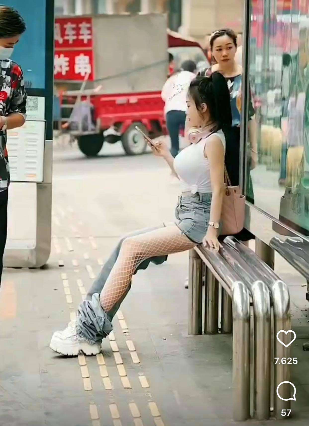 Ngồi chờ xe buýt, hot girl khiến người đi đường nhìn chằm chằm vì chiếc quần "một mất một còn".
