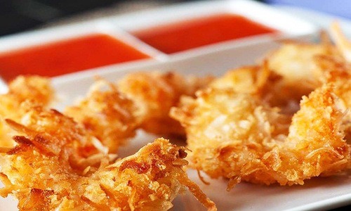 Bày tôm chiên nước cốt dừa vào đĩa, dọn dùng với xà lách và rau thơm + nước mắm chua ngọt.