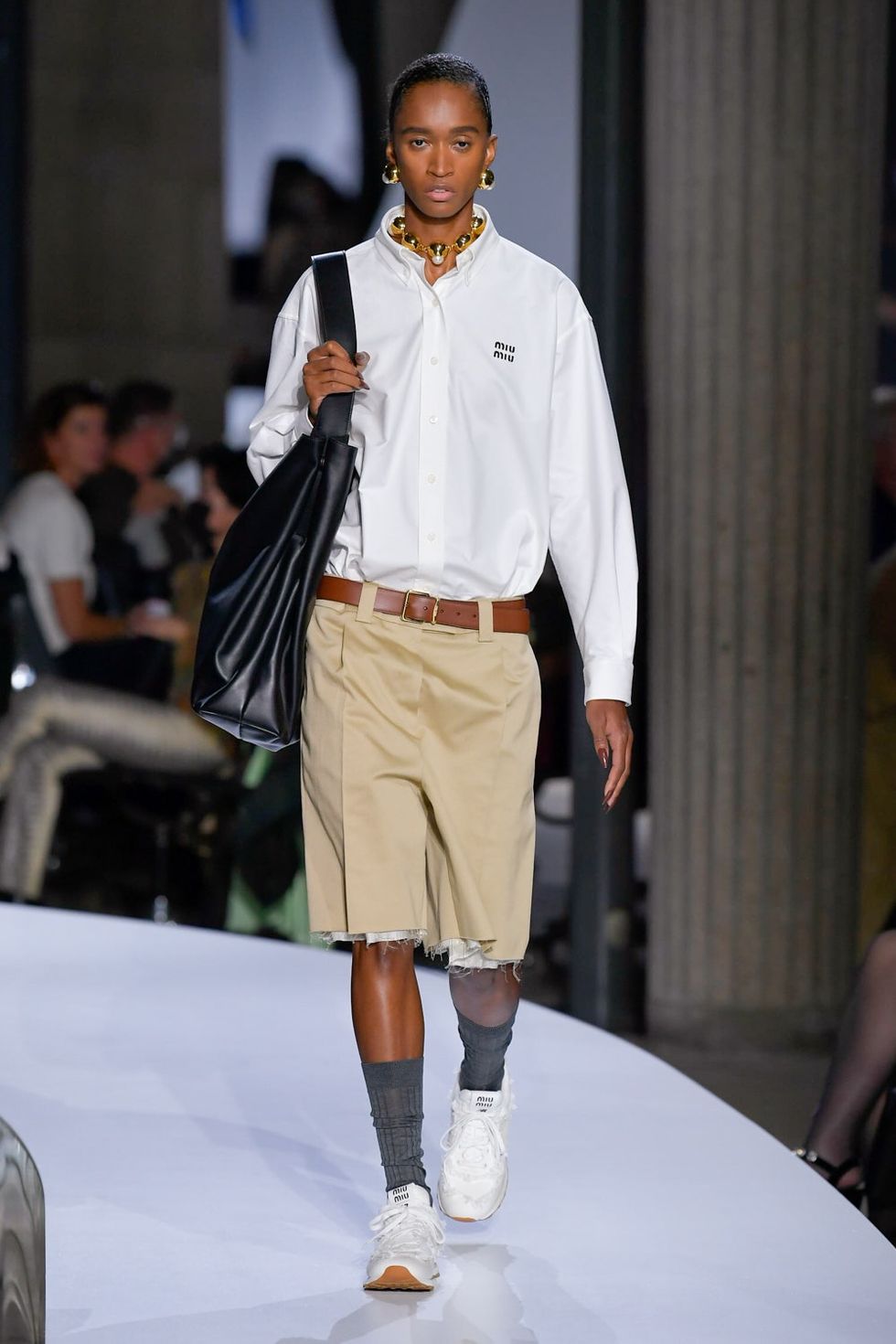 Với buổi trình diễn mới nhất cho công ty chị em của mình, Giám đốc Sáng tạo Miuccia Prada đã kết hợp khéo léo hot trend khoe eo với những trang phục cổ điển của nhà mốt và xu hướng hiện tại. Một loạt những chiếc váy ngắn cũn cỡn xuất hiện trên sàn diễn khiến người xem nhớ đến chiếc váy siêu nhỏ khó quên của Christina Aguilera trong VMAs 2002. Những chiếc váy này được kết hợp với quần tây cắt cúp và áo sơ mi có cổ, tôn lên chiều sâu của vòng một. Đồng thời, quần ống rộng và quần đùi xuất hiện nhiều lần, đưa xu hướng đầu những năm 2000 thoát khỏi gu thẩm mỹ “Dirrty” của Aguilera và trở thành một bộ trang phục trang trọng hơn.