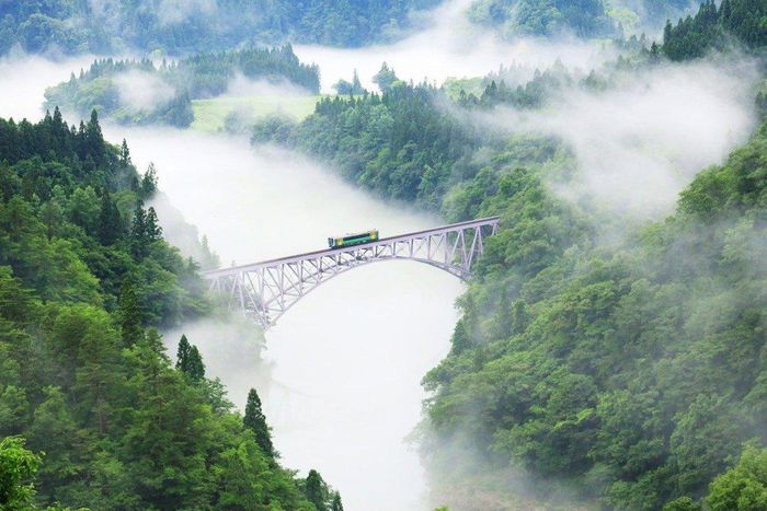 Những bức ảnh của Ken Hoshi đã thu hút rất nhiều du khách đến Oku Aizu (Nhật Bản) để chiêm ngưỡng khung cảnh chuyến tàu Tadami chạy qua thung lũng mờ sương và khu rừng mê hoặc.