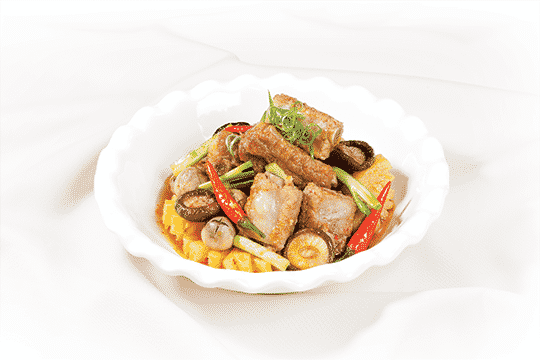 - Tiếp tục đun nóng dầu, phi thơm hành tỏi, cho sườn vào xào săn lại. Thêm ớt hiểm, nước dừa vào kho, đậy nắp khoảng 5 phút, cho tiếp thơm, nấm vào, kho mở nắp, để lửa nhỏ đến khi sườn chín mềm, tắt lửa.