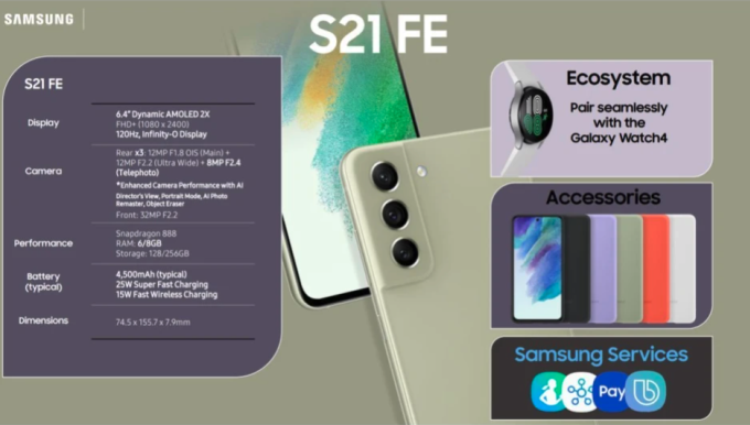 Galaxy S21 FE dự kiến được công bố ngày 11/1/2022 với giá 699 USD và 769 USD cho hai phiên bản. Với việc ra mắt trễ so với kế hoạch ban đầu, Samsung có thể sẽ tung ra nhiều chương trình khuyến mãi lớn để sản phẩm có mức giá tốt hơn.