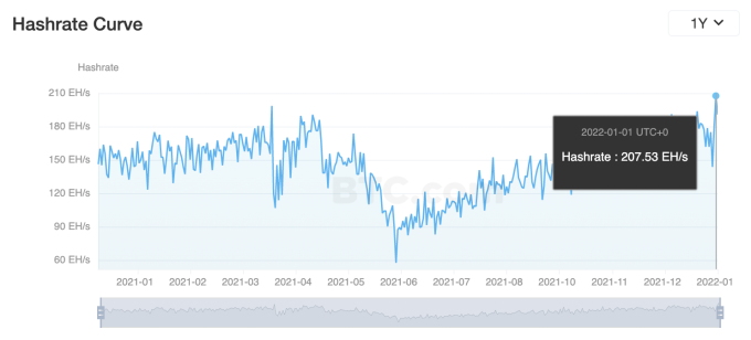 Chỉ số này đạt kỷ lục mới vào ngày 1/1 với 207,53 EH/s được ghi nhận, theo dữ liệu từ Btc.com.