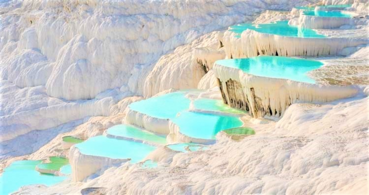 Pamukkale, Thổ Nhĩ Kỳ: Pamukkale trong tiếng Thổ Nhĩ Kỳ có nghĩa là “lâu đài bông”. Pamukkale còn được gọi là “Hierapolis”, “Thành phố Thánh”, thuộc tỉnh Denizli, tây nam Thổ Nhĩ Kỳ. Qua hàng thiên niên kỷ, các bể bơi tự nhiên rất giàu canxi cacbonat và được tạo thành từ đá vôi trắng như tuyết. Khi ngày càng có nhiều khách du lịch đến thăm nơi này, các khách sạn được xây dựng vào giữa thế kỷ 20 đã thực sự gây tổn hại đến di tích tự nhiên. Năm 1988, các khách sạn đã bị phá bỏ khi UNESCO công nhận đây là Di sản Thế giới.