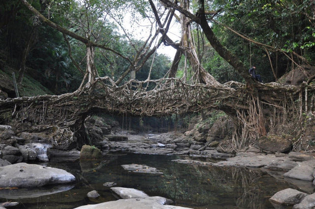 Cherrapunji, Ấn Độ được công nhận là nơi ẩm ướt nhất trên Trái Đất và rất khó khăn để đi lại cũng như di chuyển đồ đạc. Chính vì vậy từ xa xưa, War-Khasis, một bộ lạc ở Meghalaya đã nghĩ ra cách dùng rễ của cây Đa búp đỏ- một loại cây phổ biến ở vùng ẩm ướt để làm cầu. Trước tiên, họ trồng cây đa búp đỏ bên bờ sông. Khi phát triển, những rễ phụ của cây tủa ra từ thân và bám vào những tảng đá lớn dọc theo bờ sông. Dần dần, chúng vươn ra giữa dòng và bám vào bờ bên kia tạo thành cây cầu vững chắc và an toàn. Những cây cầu bằng rễ này có thể dài hơn 30m và chịu được trọng lượng của hơn 50 người cùng một lúc. Tuy nhiên, rễ phụ cần 10 đến 15 năm mới phát triển được đầy đủ.