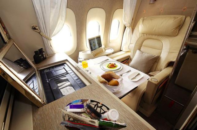 Ghế ngồi máy bay hạng nhất của hãng Etihad Airways (UAE) trông giống một phòng khách sạn với 3 không gian: phòng khách, phòng ngủ và phòng tắm. Trong phòng có tivi 32 inch, phòng tắm có vòi hoa sen và giường ngủ lớn Duxiana cao cấp. Khách được tặng miễn phí một bộ chăm sóc da và sức khỏe từ thương hiệu Ý Acqua Di Parma có từ dưỡng môi, lotion, nước súc miệng, bàn chải đánh răng, kem đánh răng, dưỡng môi, lược và đồ tẩy lông.