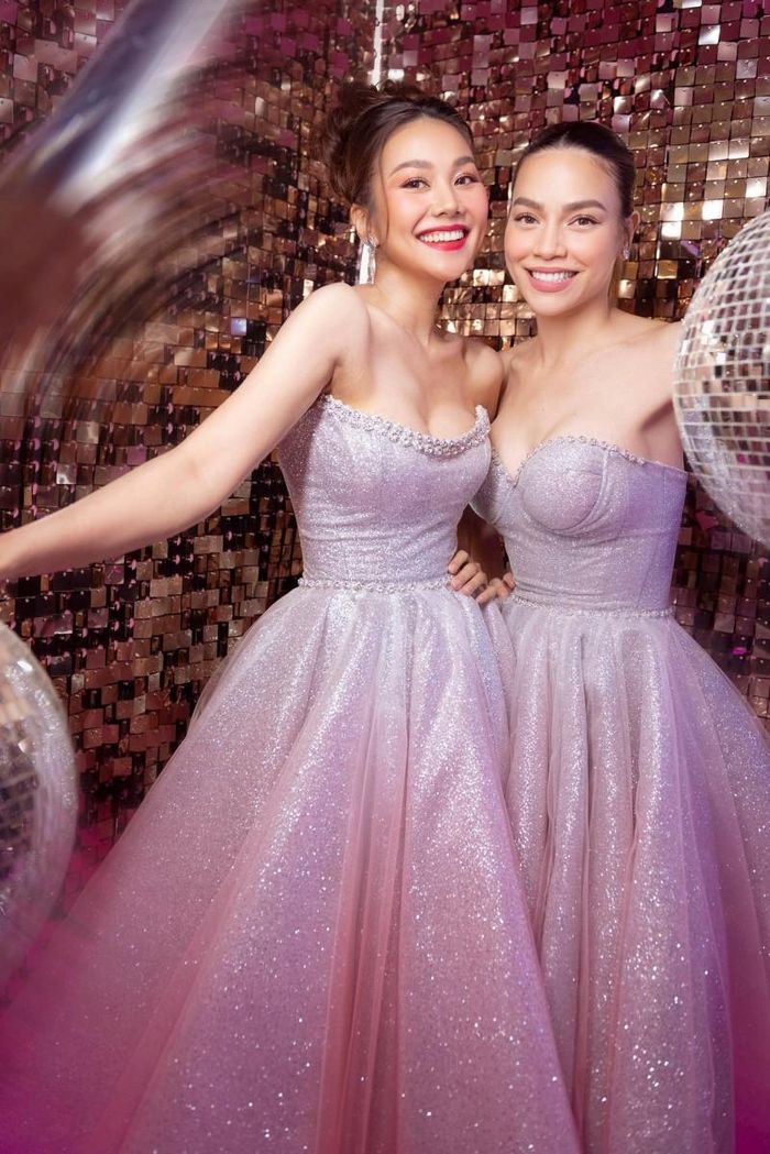 Đôi bạn thân Hà Hồ, Thanh Hằng hóa thân thành hai nàng công chúa với đầm cúp ngực gam hồng ánh bạc, cùng phần chân váy xòe rộng đầy nữ tính. Các dải đá được gắn tại viền ngực áo và eo giúp tôn triệt để vóc dáng của cặp chân dài 8X.