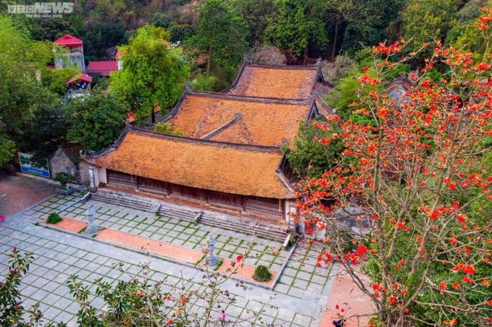 Những cây hoa gạo trong khuôn viên chùa Thầy (Quốc Oai, Hà Nội) trổ hoa rực rỡ, tạo vẻ đẹp rất riêng trong không gian ngôi chùa cổ kính.