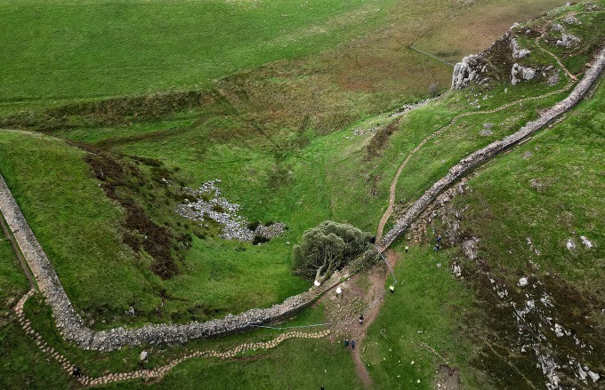 Những gì còn sót lại của cây Syncamore Gap nhìn từ trên cao. Ảnh: Reuters