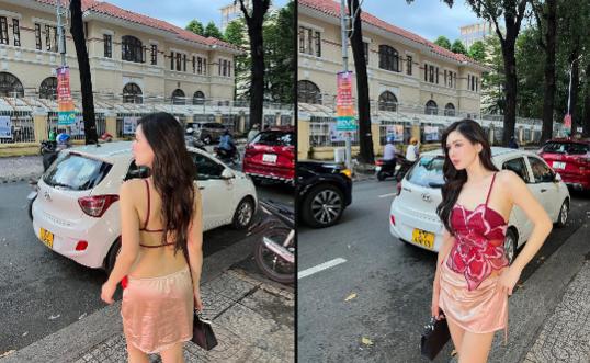 Các trang mạng chia sẻ nhiều hình ảnh một cô gái chụp hình trên đường phố ở TP.HCM, nhận được nhiều sự quan tâm của cư dân mạng. Bên cạnh vẻ ngoài xinh đẹp thì trang phục của cô gái này gây chú ý hơn cả. Trong hình, người đẹp diện áo hai dây hở lưng, kết hợp cùng chân váy lụa ngắn.