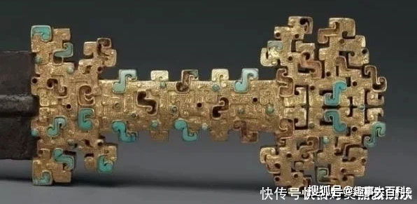 Phần chuôi này được làm từ vàng ròng, chạm khắc thành nhiều khe rỗng cực tinh xảo, bên trên còn khảm hàng chục viên ngọc xanh từ thời Thương, Chu. Quả thật ít ai có thể cưỡng lại được vẻ đẹp của bảo vật này!