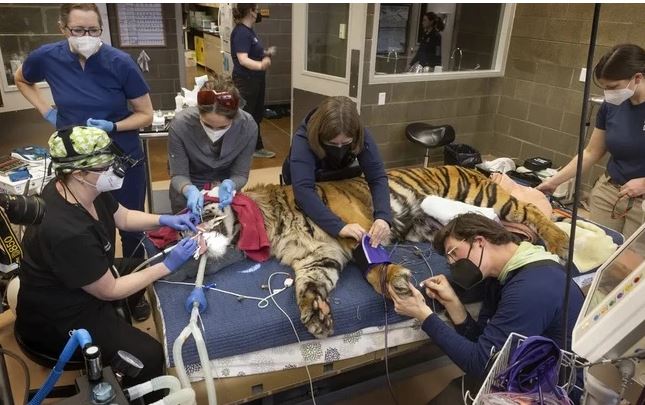Đội thú y của Sở thú Point Defiance - và một nha sĩ thú y cố vấn - nhổ răng cho con hổ Sumatra đực Sanjiv của vườn thú vào tháng 1. Ảnh: Seattle Times.