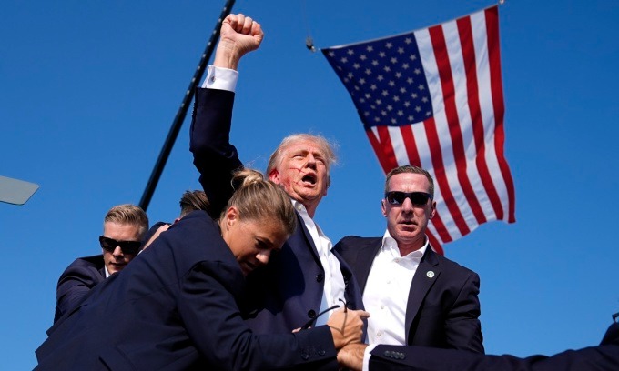 Ông Trump giơ nắm đấm thể hiện sự mạnh mẽ trong lúc được các mật vụ đưa rời sân khấu sau khi bị bắn tại Butler, Pennsylvania, ngày 13/7. Ảnh: AP