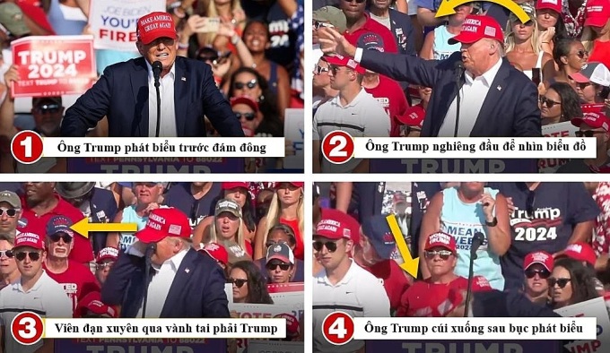 Theo Trump, ông thoát chết nhờ nghiêng đầu sang phải để xem màn hình chiếu biểu đồ về người nhập cư bất hợp pháp. Ngay lúc đó, một phát súng xuyên qua vành tai phải của ông. Máu bắn lên má và trán cựu tổng thống.