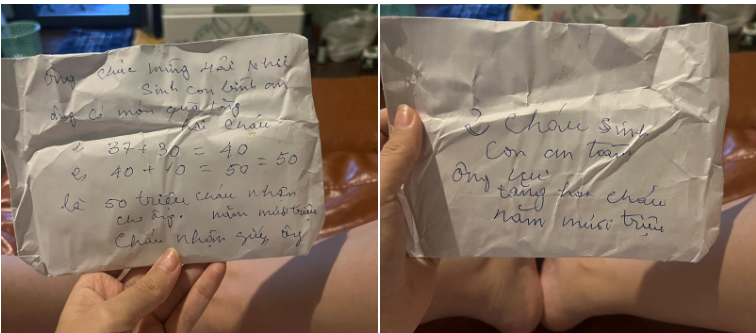 Gây chú ư hơn cả là ḍng chữ viết tay trên phong thư: “Ông chúc mừng Hải - Như sinh con b́nh an. Ông có món quà tặng hai cháu là 50 triệu, cháu nhận cho ông”.