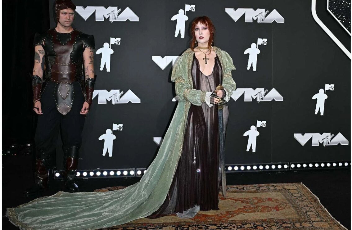 Chappell Roan tại MTV VMAs: Giọng ca Good Luck, Babe! gây tranh cãi khi bước lên thảm đỏ MTV VMAs trong bộ trang phục nữ hoàng chiến binh thời trung cổ theo cách táo bạo nhất. Mặc dù tự tin khẳng định bộ trang phục này đã 300 năm tuổi, ca sĩ người Mỹ vẫn bị chê thảm họa khi để lộ vòng một sau màn cởi áo choàng dài quét đất. Trước khi vào thảm đen, Roan tỏ ra hung hăng với nhiếp ảnh gia. Cô quát lên: "Ông hãy im mồm đi". Ảnh: People.