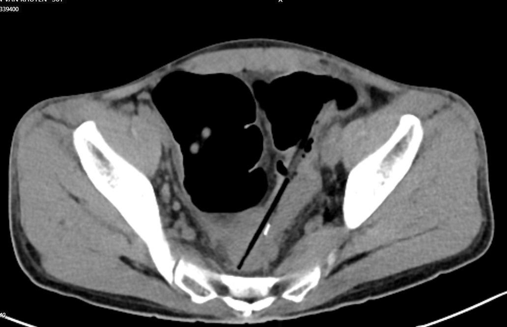 Chụp cắt lớp ổ bụng thấy hình ảnh 2 dị vật hình que đầu kim loại trong quai ruột vùng hạ vị, đâm xuyên thành ruột tạo ổ dịch khí vùng tiểu khung cạnh cơ bịt phải; Dị vật trong quai ruột hạ sườn phải; Dày thành trực tràng, đại tràng sigma và quai ruột ngang rốn; Giãn lan tỏa các quai ruột non.