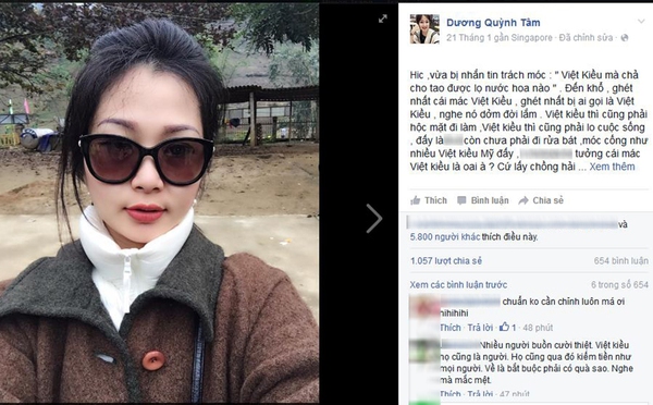 Cô cho rằng: "Ai cũng phải làm việc và trăm thứ gánh nặng phải lo và một tay vun vén hết đấy ạ, đâu phải cứ dưỡn dẹo váy bướm sang chảnh đi chơi suốt ngày như các bạn nghĩ đâu. Cứ mặc định Việt kiều là phải sang chảnh, phải mừng tuổi nhiều hơn, quà cáp nhiều hơn, là cái máy ATM ai thích vay là được à? Chán lắm, về làm nông dân cho nó sướng, đỡ ai trách móc, đỡ ai tưởng bở.