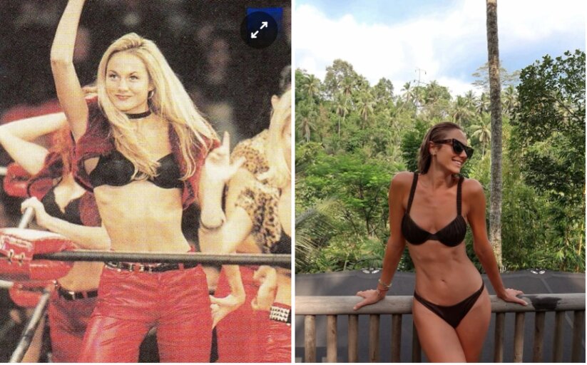 Stacy Keibler, người đẹp 45 tuổi, khiến người hâm mộ ngỡ ngàng với sắc vóc ngày càng thăng hạng sau 26 năm. Bức ảnh bên trái chụp cựu đô vật người Mỹ khi còn trẻ, đang nhảy múa vào năm 1999. Tấm hình bên phải, chụp trong năm nay, cho thấy bà mẹ 3 con khoe dáng săn chắc trong bộ bikini khi đi nghỉ dưỡng ở Bali (Indonesia).