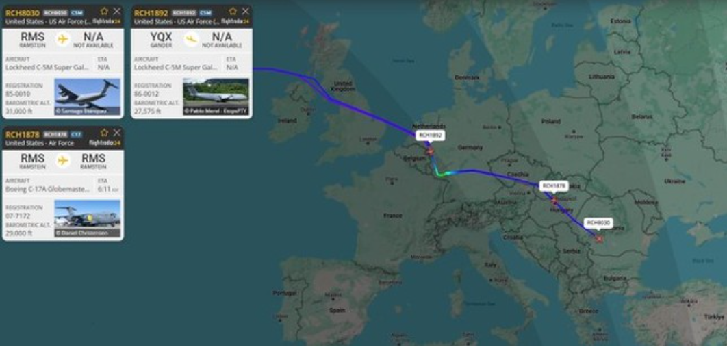 Theo dữ liệu tình báo từ OSINT, máy bay vận tải C-17A Globemaster III và C-5M Super Galaxy của Không quân Mỹ đã cất cánh từ căn cứ không quân Osan ở Hàn Quốc, bay qua châu Âu và đang trên đường đến khu vực chịu trách nhiệm của Bộ Tư lệnh Trung ương Mỹ (CENTCOM) ở Trung Đông. Một chiếc C-5M khác đã đến căn cứ không quân Ramstein ở Đức, có khả năng tiếp tục hành trình đến Trung Đông.