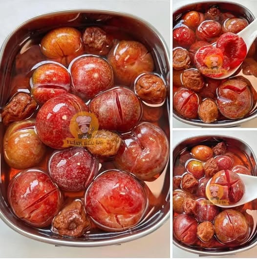 4 . Cho mận vào hộp rồi đổ nước đường xí muội vào , đậy nắp cho vào ngăn mát tủ lạnh để qua đêm là có thể dùng được rồi .