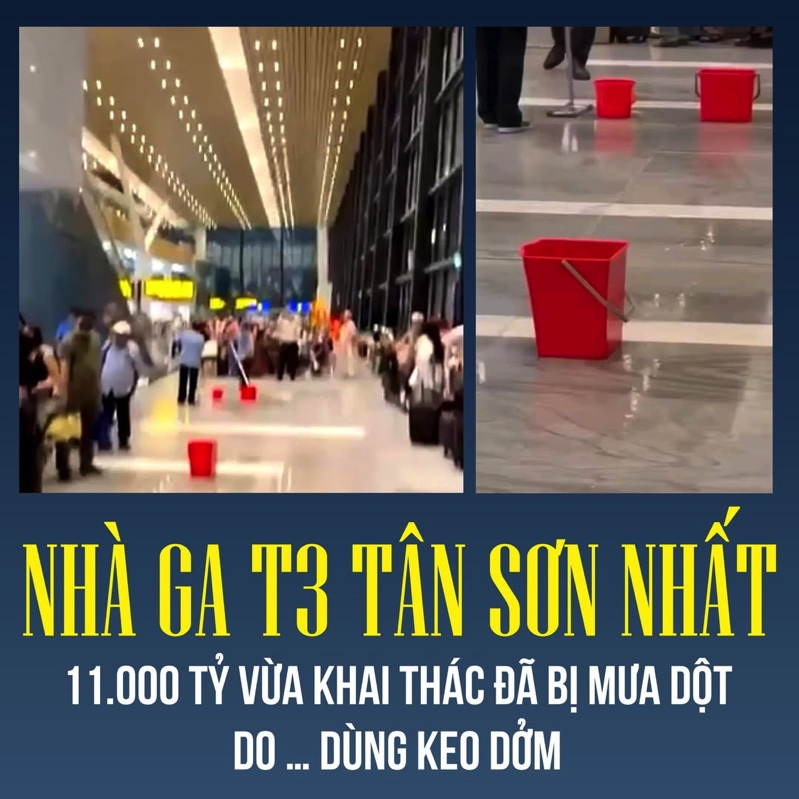 Ga T3 Tân Sơn Nhất có tổng mức đầu tư gần 11.000 tỷ đồng được đưa vào khai thác từ hôm 17/4. Mới đi vào sử dụng chưa đầy 1 tháng nhưng nhà ga ngh́n tỷ đồng đă bị mưa dột tại khu vực sảnh chờ ra cửa khởi hành nhà ga khiến nhiều nhân viên phải đến lau dọn, dùng xô đựng nước.