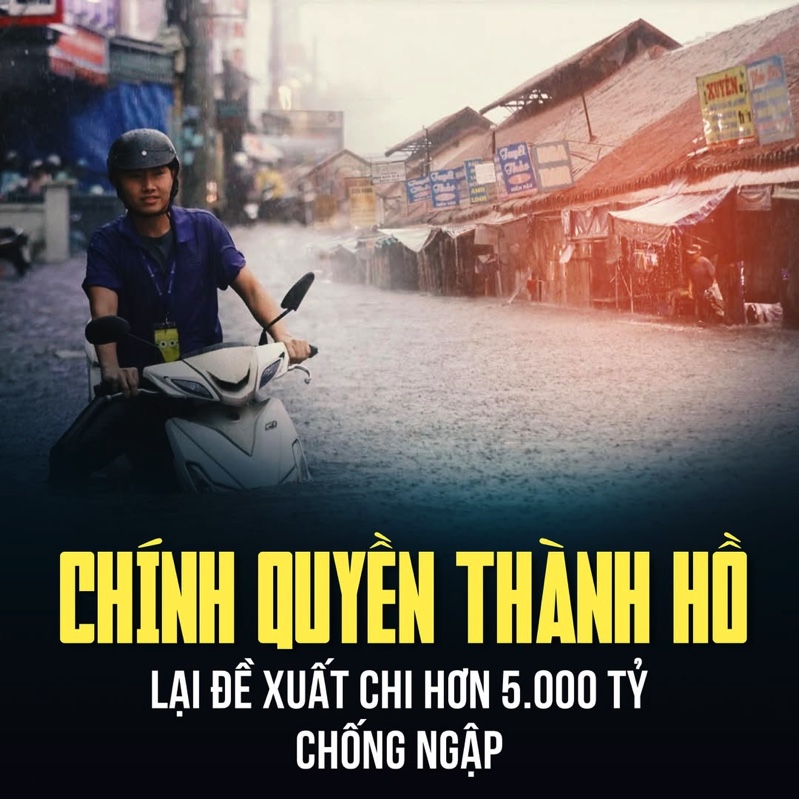 Sau đúng duy nhất một cơn mưa đầu mùa đă làm cả khu vực Chợ Thủ Đức ngập lụt. Chính quyền thành hồ liền đề xuất chi hơn 5.000 tỷ đồng để chống ngập. Trong khi đó, mới năm ngoái, một công tŕnh chống ngập trị giá gần 250 tỷ cũng vừa mới khánh thành để ngạo nghễ mừng ngày 30/4, được hai tuần nhưng ngập vẫn hoàn ngập.