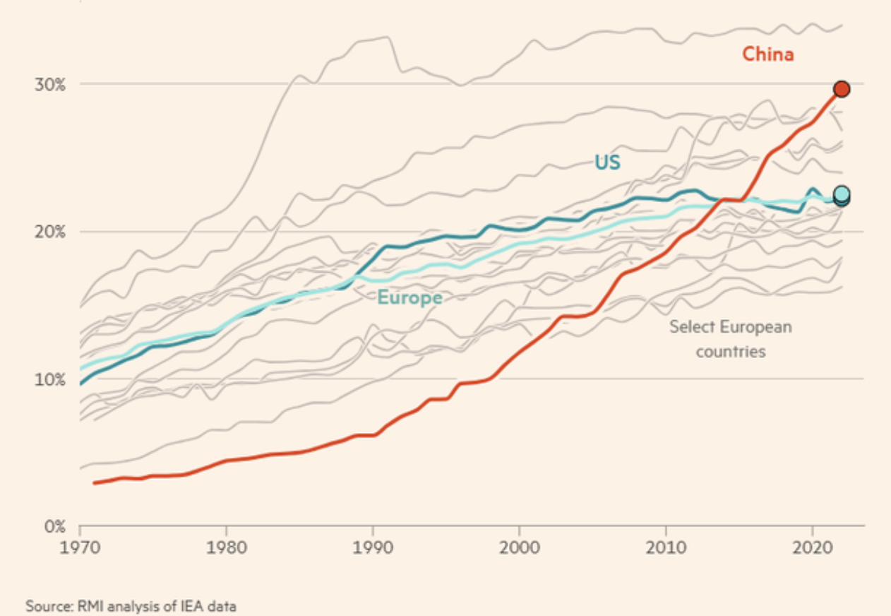 Tuy nhiên, ngay cả cách đây một thập kỷ, tỷ lệ điện khí hóa của Trung Quốc đã vượt qua châu Âu và Mỹ. Kể từ đó, các nền kinh tế đối thủ này duy trì tỷ lệ điện khí hóa ổn định ở khoảng 22%, trong khi tỷ lệ này ở Trung Quốc đã tăng nhanh lên 30%.