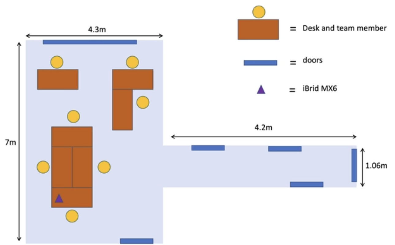 Sơ đồ mô phỏng căn phòng thử nghiệm. 7 người ngồi làm việc với các cửa sổ và cửa ra vào được bít kín.