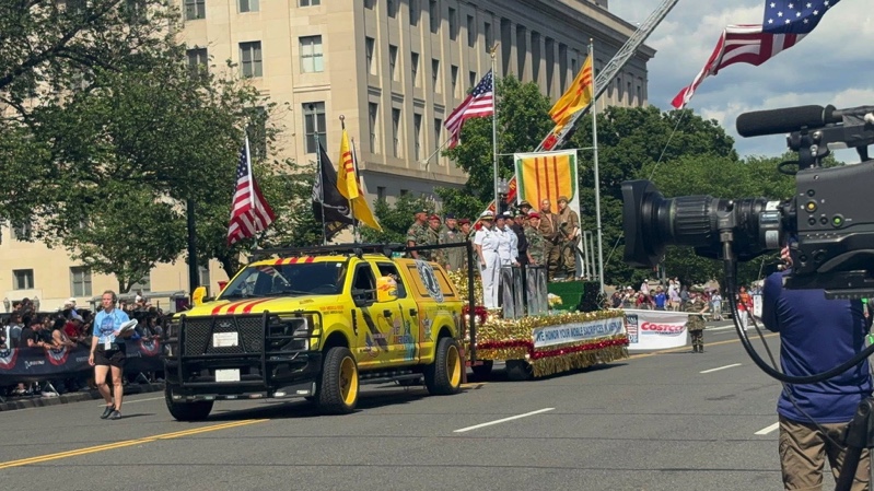Khi phái đoàn , cầm biểu ngữ, toán quốc quân kỳ, xe hoa có những cô chú cựu chiến binh Việt Nam Cộng hòa , và hai nử quân nhân Mỹ gốc Việt , đứng lên chào và 1 xe hoa , 1 xe truck của Trường Giang , xe truck chở những lá cờ bay phất phới.