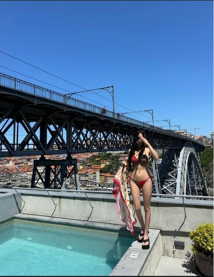 Cô nàng đã nắm bắt hoàn hảo cả phong cách địa phương và cảm quan thời trang với bộ bikini màu đỏ và khăn quàng cổ nổi bật.