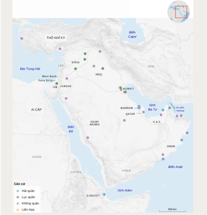 Mỹ đã duy trì hiện diện quân sự ở Trung Đông trong nhiều thập kỷ, hiện có 40.000-50.000 quân đồn trú tại ít nhất 19 căn cứ quân sự.