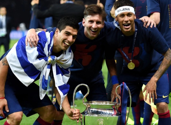 Luis Suarez (trái) từng kết hợp với Lionel Messi (giữa) và Neymar thành bộ ba trứ danh của Barca dưới thời Luis Enrique. Ảnh: FCB