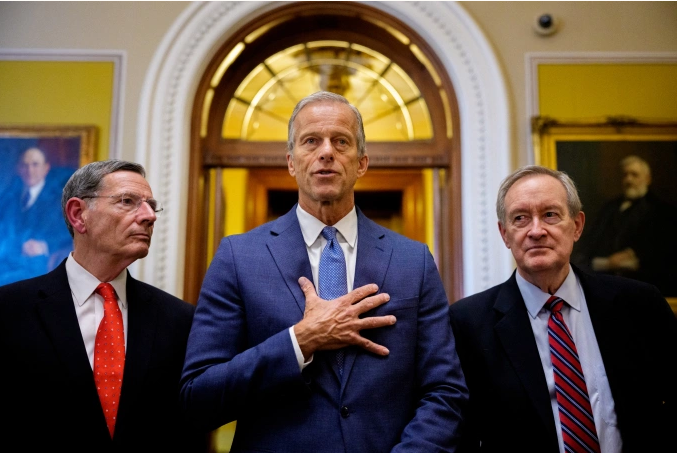 Lãnh đạo phe đa số tại Thượng viện John Thune (giữa) trả lời báo giới tại Đồi Capitol ngày 1/7. Ảnh: AFP