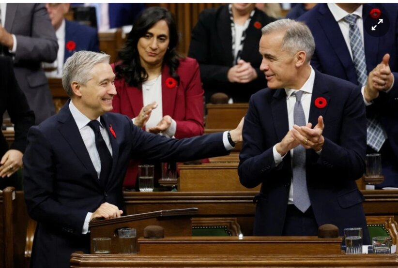 Thủ tướng Canada Mark Carney (phải) và Bộ trưởng Tài chính François-Philippe Champagne trong buổi công bố dự thảo ngân sách ban đầu hôm 4/11 ở Ottawa, Canada. Ảnh: Reuters.