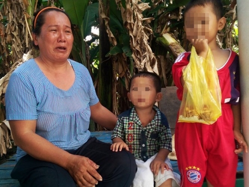 Bà Duyên ngồi cùng 2 cháu ngoại côi cút, đau đớn kể lại sự việc. (Ảnh: TNO)