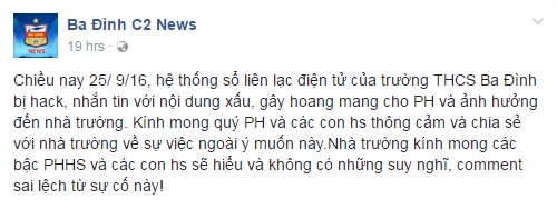 Trước sự việc trên, phía nhà trường THCS Ba Đình đã cho biết đây là một vụ hack vào sổ liên lạc điện tử. Nhà trường tuyệt đối không có phát ngôn gây sốc, khiếm nhã, kém tôn trọng như vậy đối với học sinh và phụ huynh của trường. Hiện nhà trường đang kiểm tra lại hệ thống và đề nghị Sở Giáo dục - Đào tạo Hà Nội có phương án xử lý.