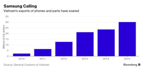 Khoản đầu tư 15 tỷ USD của Samsung vào Việt Nam, bao gồm nhà máy sản xuất pin Samsung SDI Co, đã biến Việt Nam trở thành công xưởng mới trong ngành sản xuất thiết bị điện tử. Hãng điện tử Hàn Quốc này cùng là doanh nghiệp có đóng góp lớn nhất vào xuất khẩu của Việt Nam với 33 tỷ USD trong năm 2015.