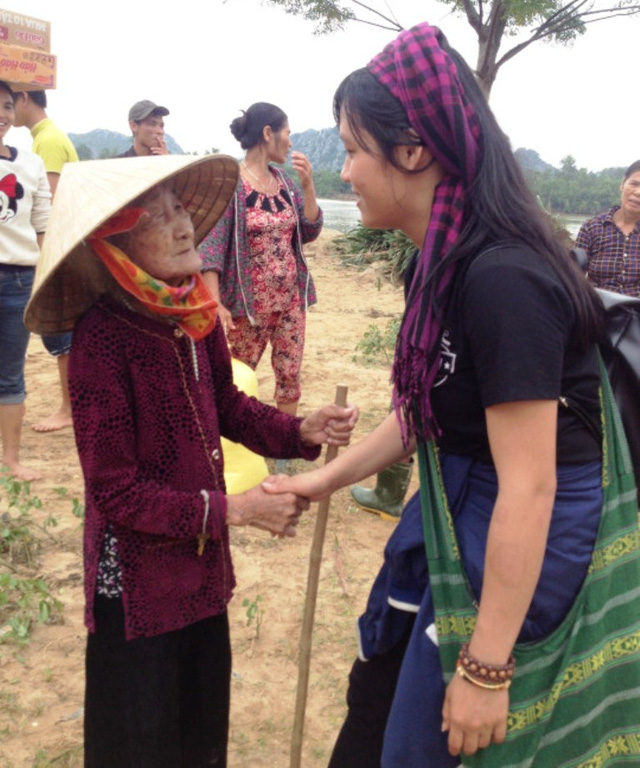 Hương nói chuyện với một cụ bà 100 tuổi trong chuyến đi giúp bà con vùng lũ tại Quảng Bình. Ảnh: L.H