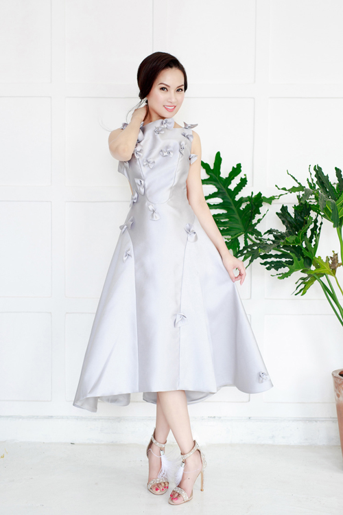 Khi diện váy ánh kim đính nơ điệu đà, Hà Phương phối trang phục với sandal đính đá trắng.