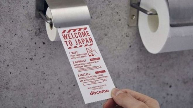 Được tài trợ bởi tập đoàn điện thoại di động khổng lồ của Nhật Bản có tên NTT Docomo, loại giấy vệ sinh này có in các thông tin về mạng wifi công cộng, cũng như các phần mềm ứng dụng cho điện thoại liên quan đến việc đi lại của công ty.