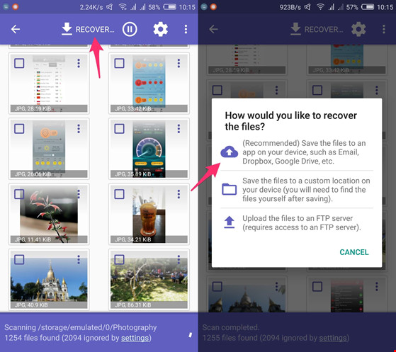 - Bước 3: Khi hoàn tất, người dùng chỉ cần đánh dấu chọn vào các tập tin cần phục hồi rồi nhấp vào nút Recover, sau đó lựa chọn nơi lưu trữ tương ứng như email, Dropbox, Google Drive...