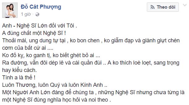 "Anh - Nghệ Sĩ Lớn đối với Tôi. Anh đúng chất một Nghệ Sĩ! Thoải mái, ung dung tự tại, không bon chen, không giẫm đạp và giành giựt chén cơm của bất cứ ai... Không đố kỵ, không ganh tị, không biết ghét bỏ ai ...Ra đường, vẫn đôi dép lê và cái quần đùi... Anh không thích loè loẹt, sang trọng hay kiểu cách.Tính anh là thế! Luôn Thương, luôn Quý và luôn Kính Anh... Một Người Anh Lớn đáng để chúng ta, những Nghệ Sĩ nhưng chưa từng là một Nghệ Sĩ đúng nghĩa học hỏi và noi theo".