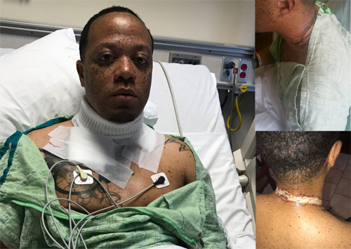 Phần da vòng quanh gáy và bàn tay (khi giật thẻ bài) của anh hằn rõ vết sợi dây kim loại. Day được xác định bỏng độ hai và ba và phải nằm viện điều trị trong ba ngày.