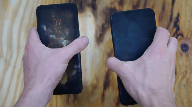 Cuối cùng, anh chàng tiếp tục châm lửa đốt lần thứ 2. Kết quả rất bất ngờ khi iPhone 7 đã chết ngỏm, trong khi đó Galaxy S8 mặc dù bị cháy sém gần hết, thế nhưng phần màn hình vẫn hiển thị được một vài thông tin ít ỏi, chứng tỏ là nó có khả năng chịu đựng tốt hơn rất nhiều so với đối thủ đến từ phía Apple. và đốt bộ đôi siêu phẩm này thêm một lần nữa.