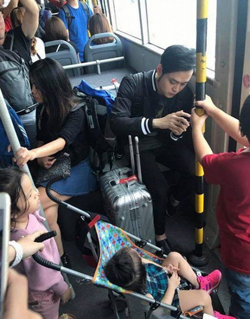 Tuy nhiên, điều đáng nói ở đây là trước mặt anh có khá nhiều hành khách trẻ nhỏ đang đứng vì không có ghế ngồi, thì nam ca sĩ lại thản nhiên ngồi và chuyên chú dán mắt vào điện thoại.