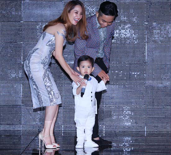 Con trai của cặp đôi, bé Kubi khá bạo dạn đòi mic của mẹ để nói khi lên sân khấu chào khán giả