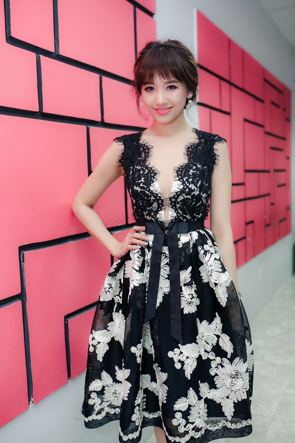 Bà xã Trấn Thành vô cùng xinh đẹp, lộng lẫy khi lựa chọn cho mình chiếc đầm xòe họa tiết đen trắng thanh lịch với điểm nhấn là những đường ren cách điệu cùng phần xẻ ngực sâu hút mắt.