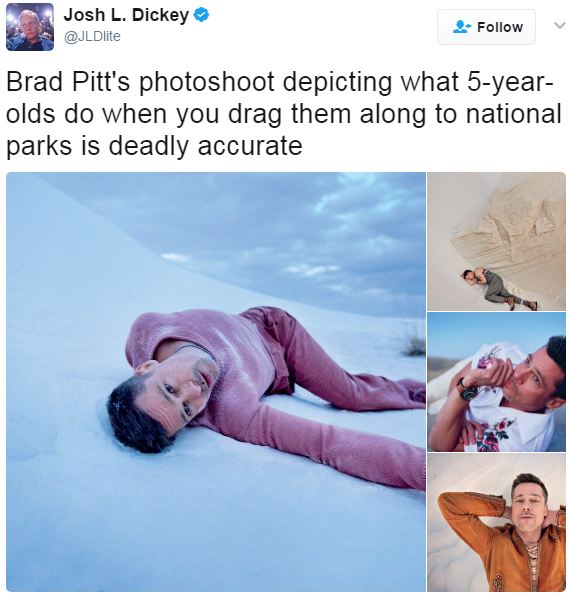 Tuy nhiên, thay vì tập trung vào những chia sẻ của Brad, thì nhiều độc giả của tạp chí GQ lại bị phân tâm vì bộ ảnh với những tư thế tạo dáng không được tự nhiên lắm. Bộ ảnh được đặt tên là "Brad Pitt tại các công viên quốc gia của Mỹ", chụp ở các công viên Everglades, White Sands và Carlsbad Caverns. Và những kiểu tạo dáng như đang "diễn quá sâu" của Brad trong đó đã trở thành đề tài bị châm biếm không ngớt trên mạng xã hội.