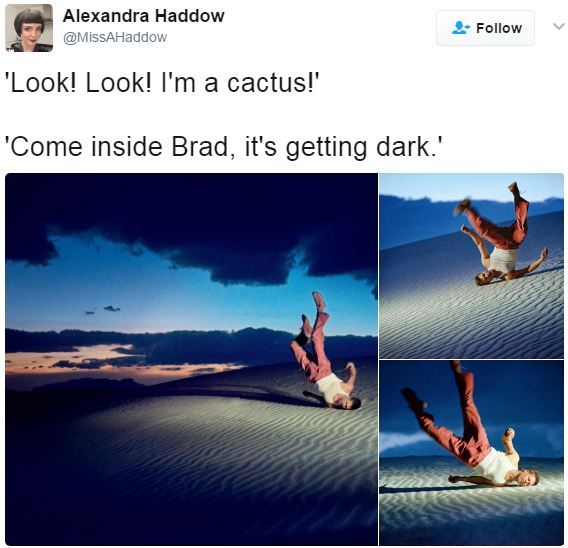 Brad: "Nhìn này! Tôi giống cây xương rồng ghê!". Tôi: "Vào nhà đi Brad, tối rồi"